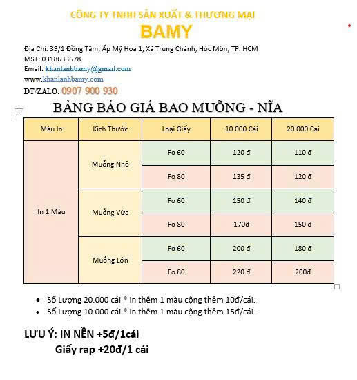 | BẢNG BÁO GIÁ BAO MUỖNG - NĨA | ||||