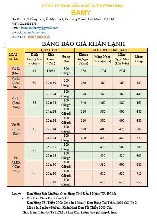 | BẢNG BÁO GIÁ KHĂN LẠNH | |||||||